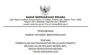 JAKARTA – Badan Kepegawaian Negara (BKN) mengumumkan pembatalan dan penggantian kelulusan sejumlah peserta seleksi CPNS